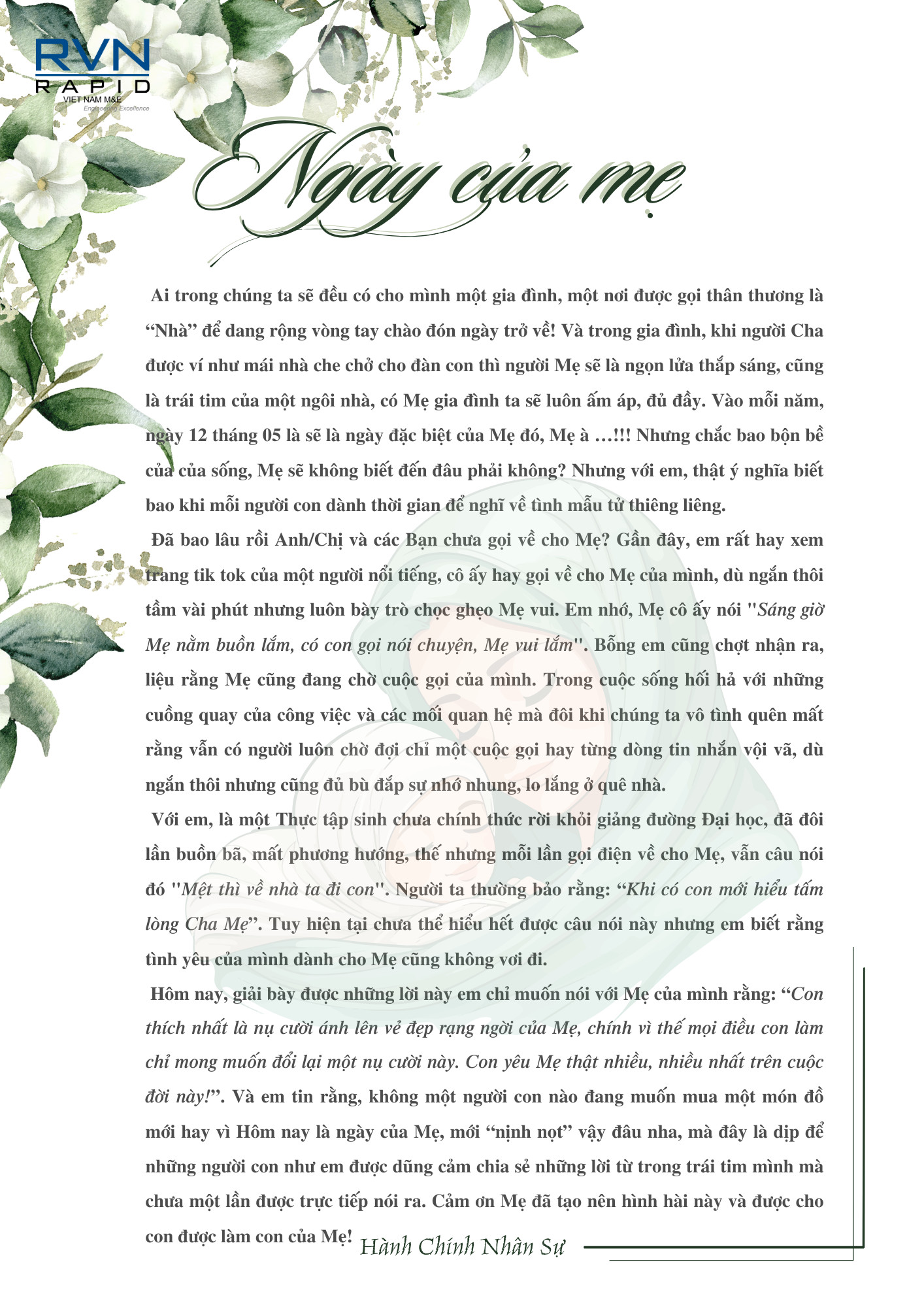 As part of the communication activities in May 2024, RAPID VIETNAM M&E CO., LTD. has launched a movement to Departments/Offices to WRITE ARTICLES SHARING THOUGHTS ON ONE OF TWO TOPICS: Mother's Day or International Family Day.